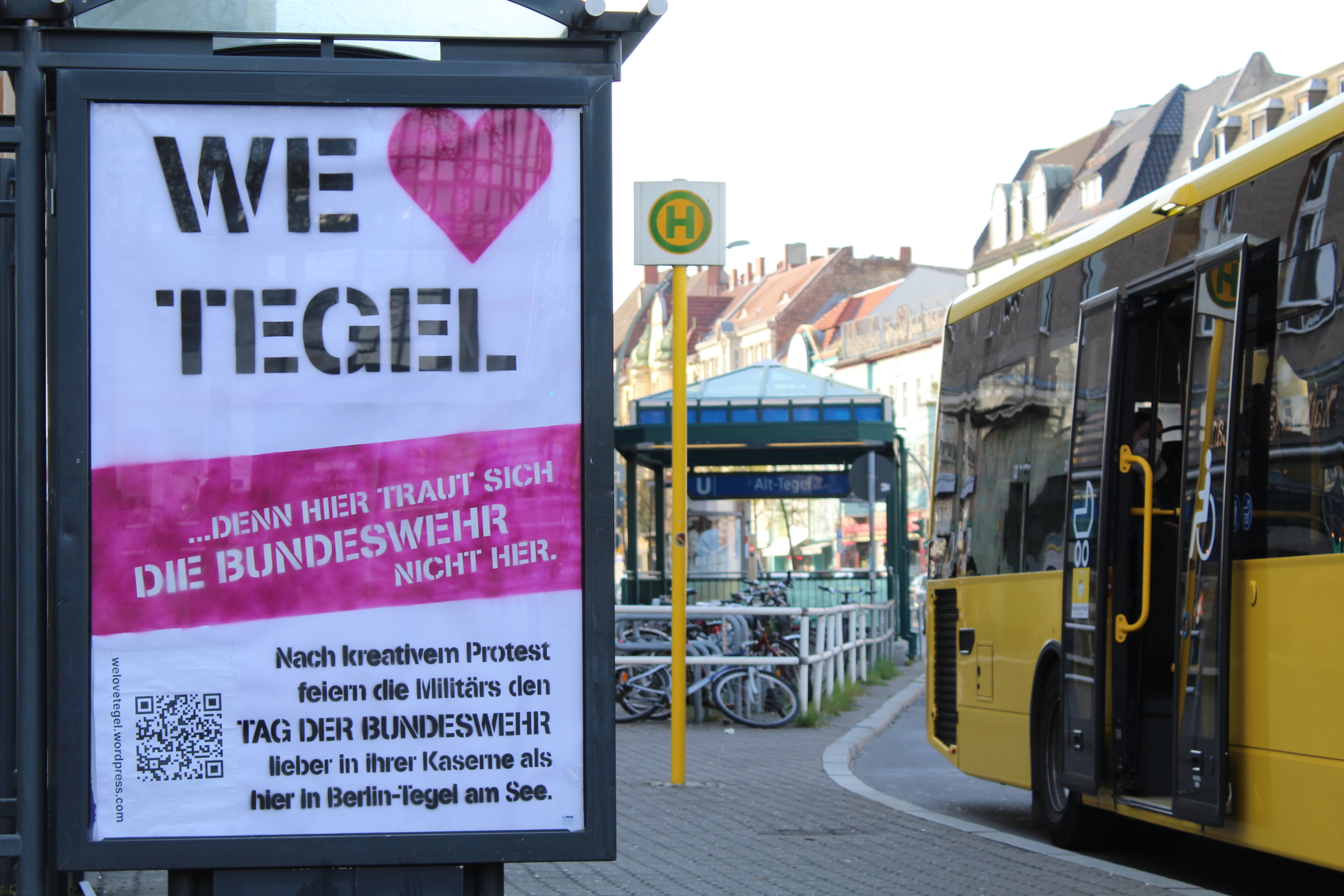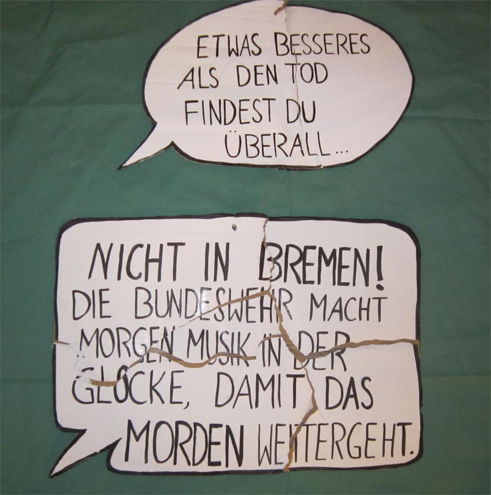 Einen Tag vor dem Konzert des Musikkorps der Bundeswehr in der Bremer Glocke hat die Künstler*innengruppe MoM „Musik ohne Militär“ den Bremer Stadtmusikanten vor dem Rathaus zwei Sprechblasen umgehängt. Die Stadtmusikanten in Form der Skulptur von Gerhard Marcks positionieren sich darin gegen das für den 28. April geplante Benefizkonzert für den „Volksbund Deutsche Kriegsgräberfürsorge“. In der ersten Sprechblase kräht der obenstehende Hahn den bekannten Spruch aus dem Märchen: „Etwas Besseres als den Tod findest du überall…“ Der untenstehende Esel anwortet darauf in einer zweiten Sprechblase: „Nicht in Bremen. Die Bundeswehr macht morgen Musik in der Glocke, damit das Morden weitergeht!“