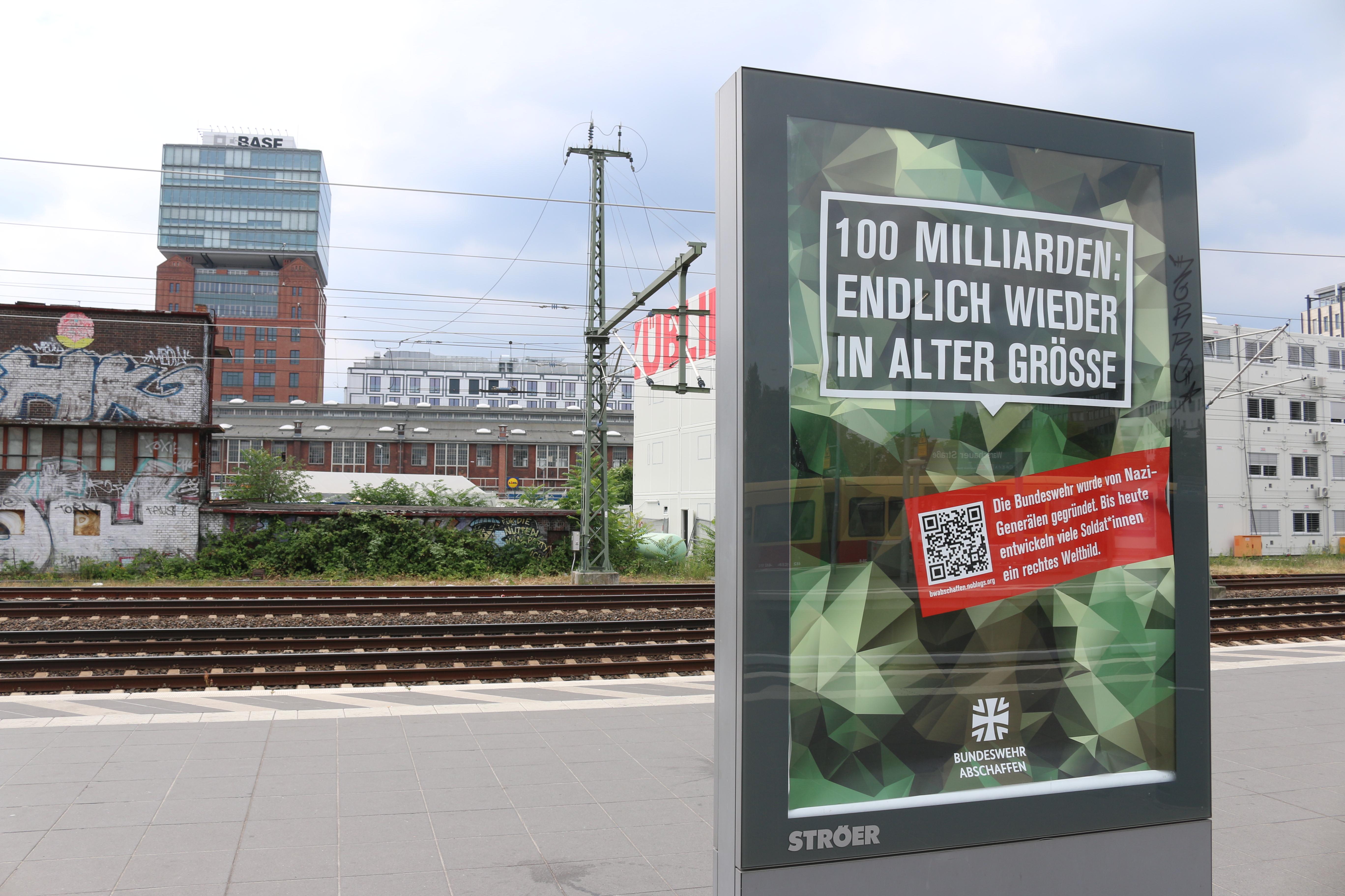 Auf einem der Poster steht „100 Milliarden: endlich wieder in alter Größe“. Ergänzend heißt es: „Die Bundeswehr wurde von Nazi-Generälen gegründet. Bis heute entwickeln viele Soldaten ein rechtes Weltbild“. Bundeskanzler Olaf Scholz behauptet, das Sondervermögen für die Bundeswehr sei „(…) die richtige Antwort auf die Zeitenwende“. Auch Finanzminister Christian Lindner findet nichts als gute Worte für das Mega-Aufrüstungspaket und freut sich schon darauf, „eine der handlungsfähigsten, schlagkräftigsten Armeen in Europa“ zu bekommen. „Man könnte meinen, die freuen sich über das Sterben und Leiden in der Ukraine. Militärische deutsche Großmachtphantasien werden wieder so richtig salonfähig“, sagt Klara Fall, Sprecher*in der Aktionsgruppe „Bundeswehr Abschaffen“: „An die deutsche Geschichte und daran, dass die Bundeswehr von Nazis-Generälen gegründet wurde, erinnern sie sich dabei leider nicht“.