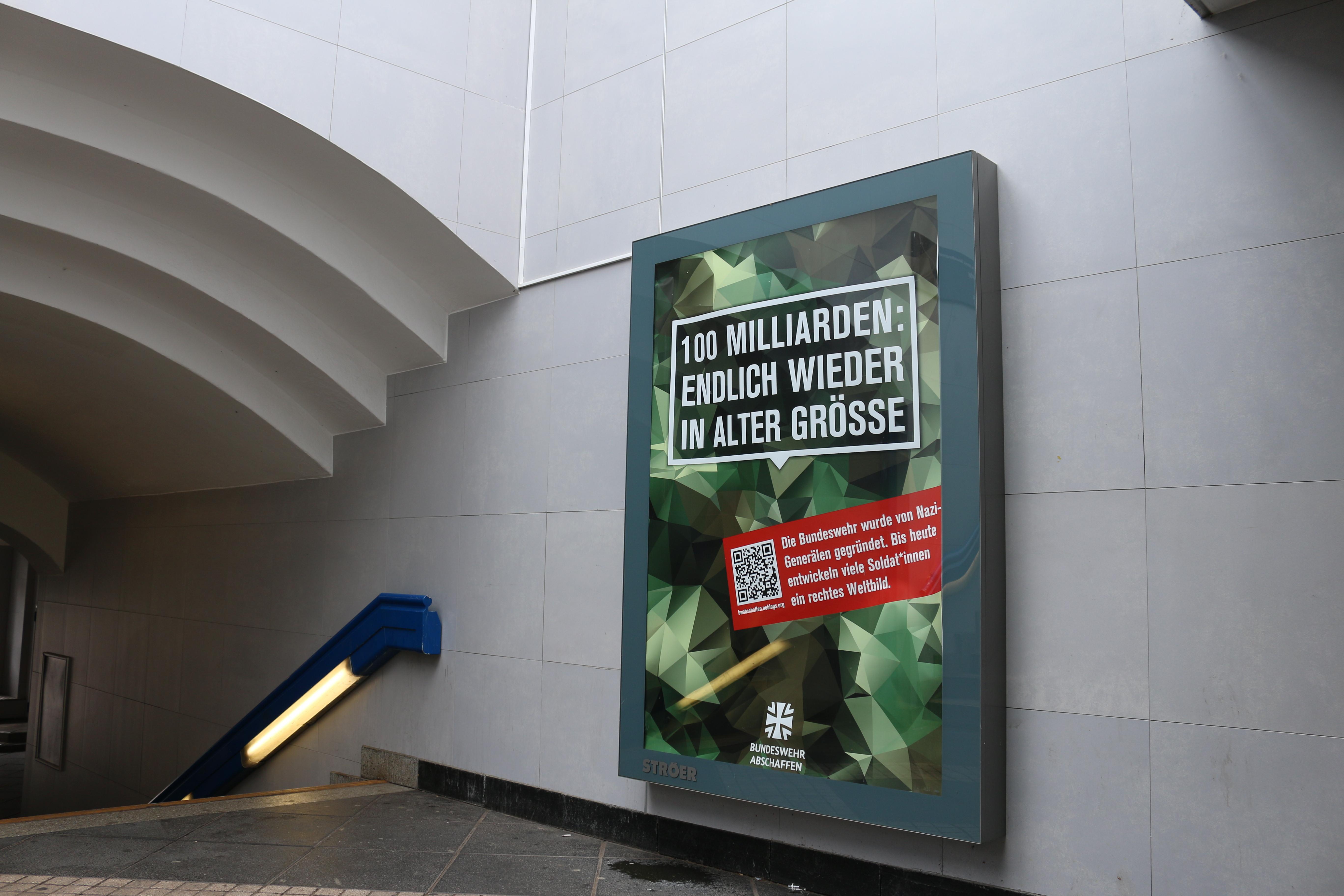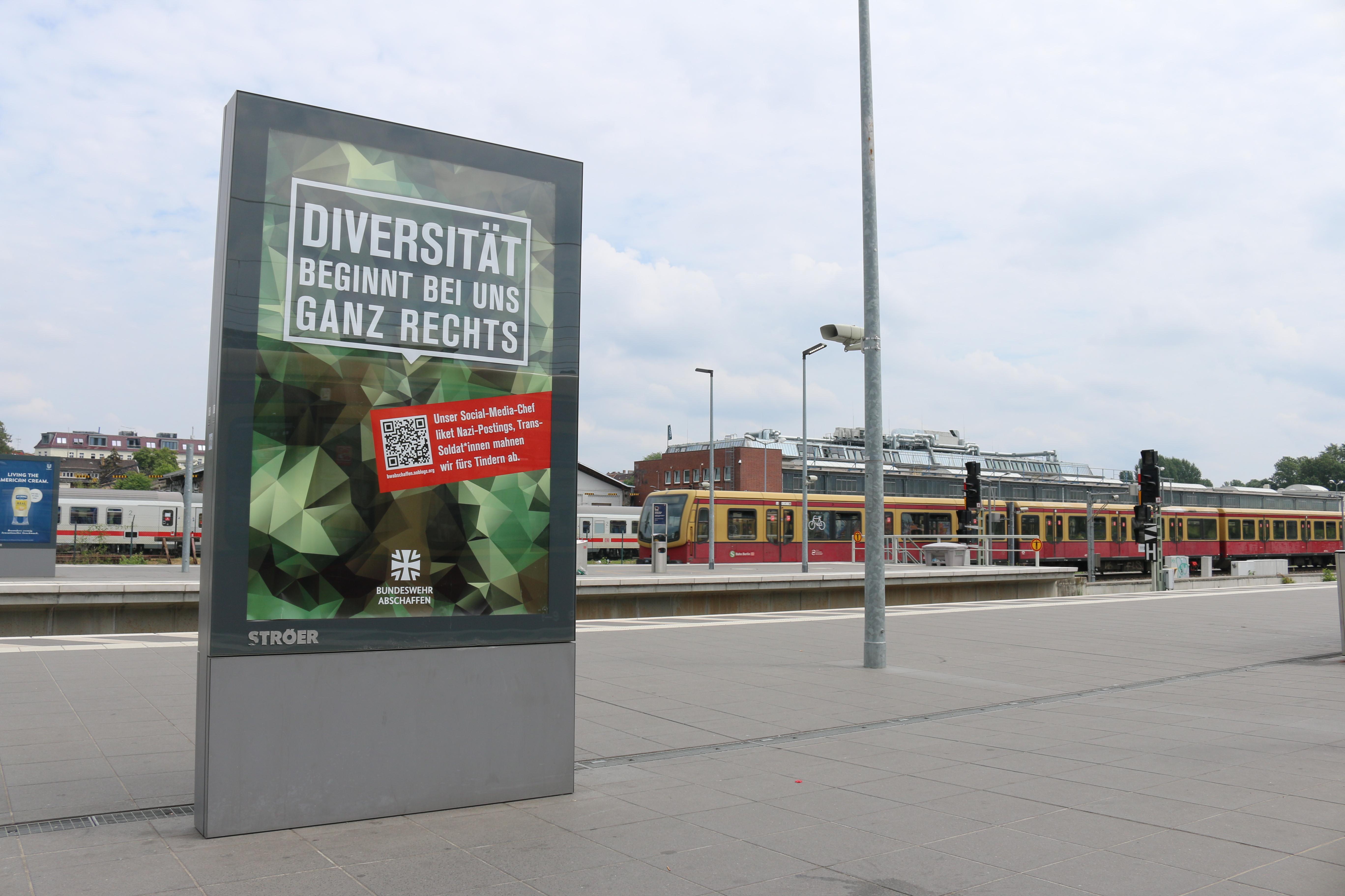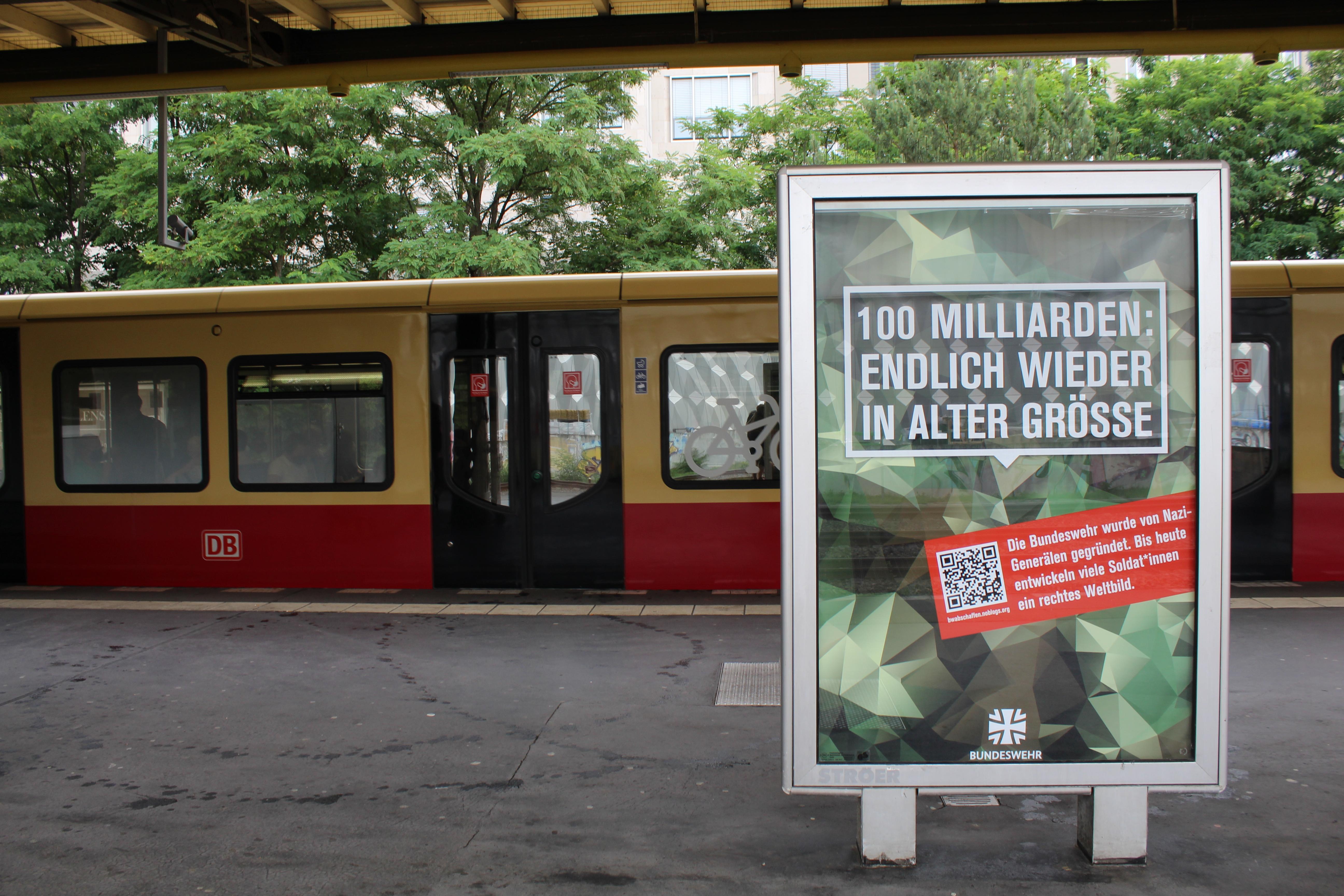 Die Aktionsgruppe „Bundeswehr abschaffen“ hängt zum 25. Juni gefälschte Werbeposter der Bundeswehr in die S- und U-Bahnhöfe Berlins. Dieser politischen Protestform namens Adbusting bediente sie sich anlässlich des erneut ausgefallenen Tags der Bundeswehr 2022, der ursprünglich für dieses Datum geplant war. „Dass der Propagandatag des Militärs jetzt schon zum dritten Mal ausfällt, finden wir super“, sagt Klara Fall, Sprecher*in der Aktionsgruppe: „Und auch dieses mal wollten wir uns die Chance nicht entgehen lassen, mit falschen Werbepostern Kritik am Militär zu üben“.