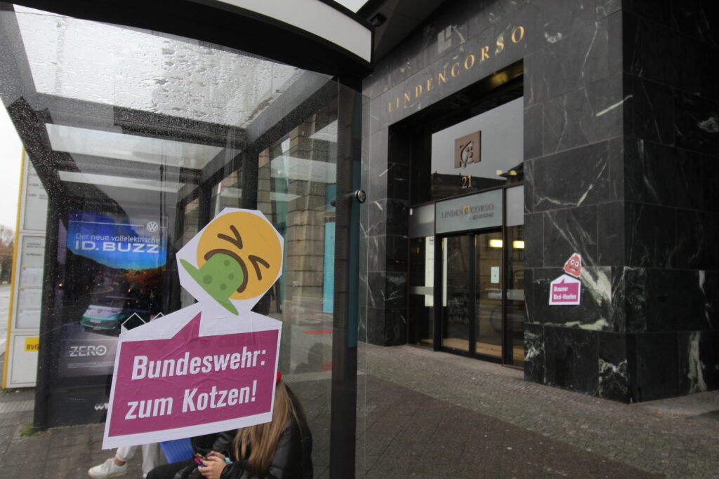 Immer noch besucht die Gruppe a.a.k. (Antimilitaristischer Adventskalender) in unregelmäßigen Abständen Liegenschaften der Bundeswehr in Berlin. Deshalb berichten sie auf Indymedia, dass sie den Lindencorso, Unter den Linden 21, besucht haben. Im Lindencorso sitzt neben ganz viel Rüstungsindustrie auch der „Bund Deutscher Einsatz Veteranen e. V.“´ Vor dem Lindencorso sieht man nun einen großen Kotz-Smileys mit einer Sprechblase. In der Sprechblase steht: „Bundeswehr zum Kotzen!“ Und auf der Wand klebt ein großer Kack-Smiley. Er sagt: „Brauner Nazihaufen“.