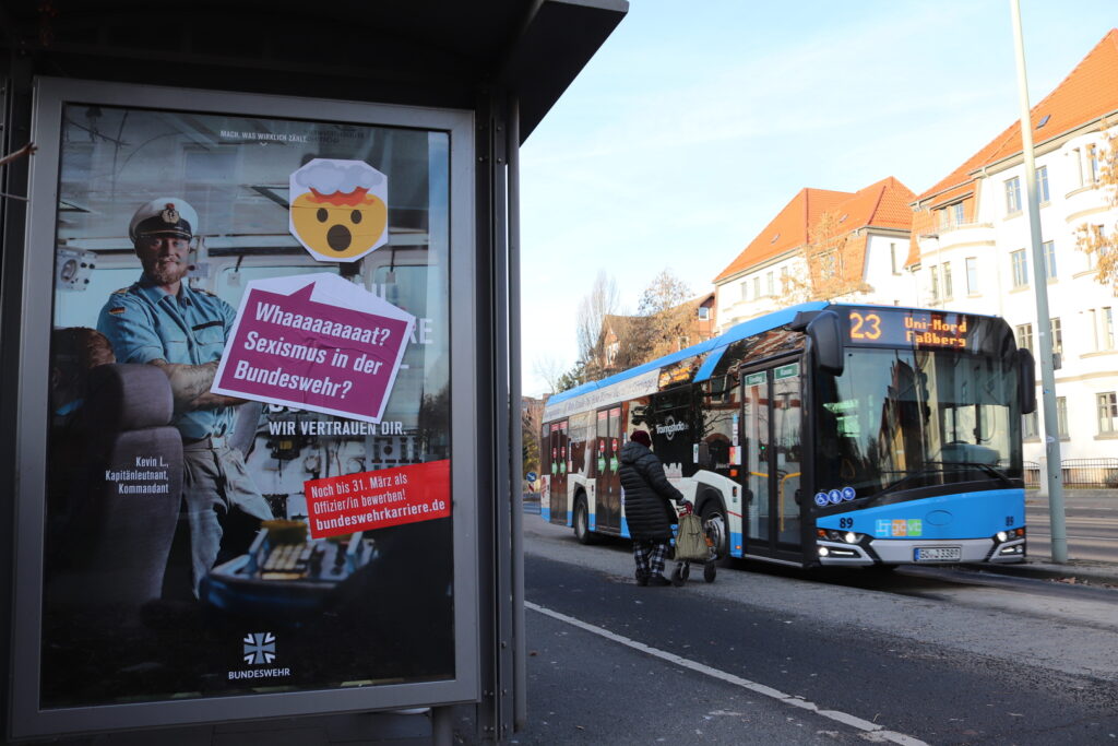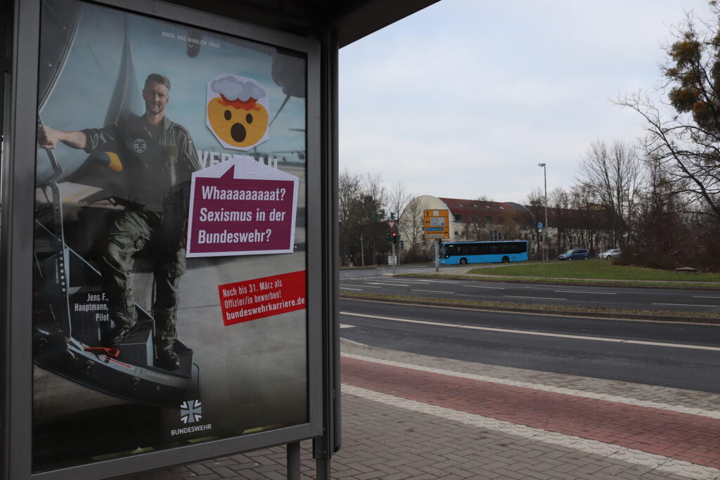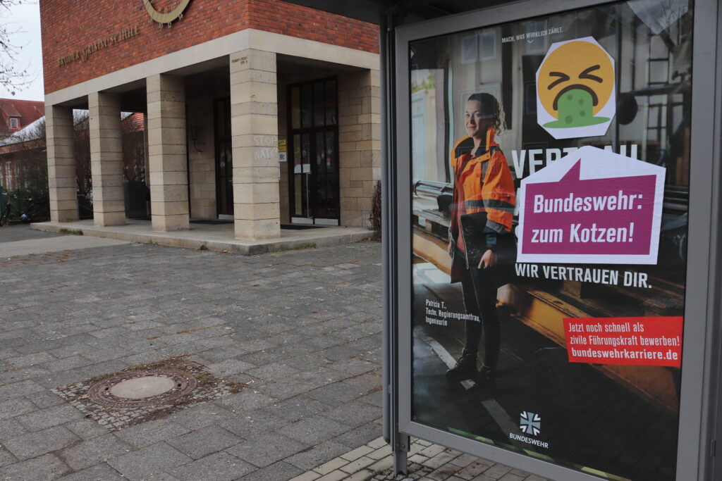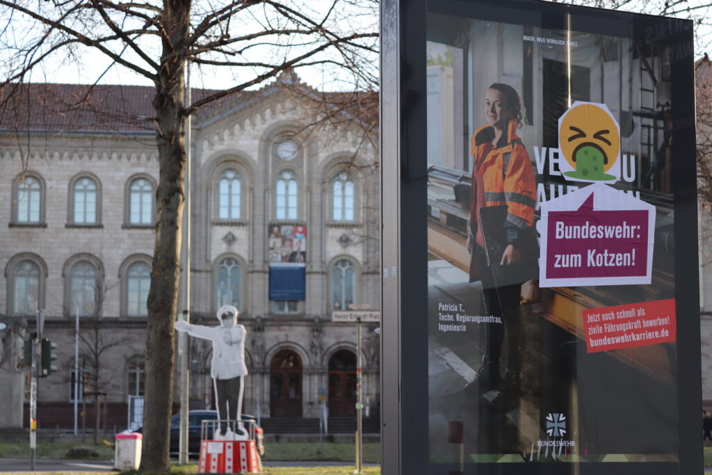 Am Dienstag dieser Woche haben die Bundeswehr-Plakate, die nun von den Aktivist*innen umgestaltet wurden, den öffentlichen Raum in Göttingen über Nacht eingenommen. Vor allem an Bushaltestellen hängen die Poster des Militärs, die mit Portrait-Fotos von Soldat*innen und militaristischen Idealen wie Kameradschaft für eine Laufbahn als Führungskraft in der Bundeswehr werben. Karl Kleber, Sprecher*in der Aktionsgruppe Störpflicht, erklärt, warum die Gruppe die Werbung überklebt hat: „Die Bundeswehr-Plakate dienen der Anwerbung von Menschen in ein Berufsfeld, welches sich um das Töten und Sterben dreht. Aber weder das berufliche Morden, noch der im Militär tiefsitzende Sexismus, noch die rechtsextremen Tendenzen in der Truppe werden in der Rekrutierungskampagne thematisiert. Da mussten wir im Sinne der Bildung der Göttinger Öffentlichkeit dringend Ergänzungen vornehmen.“