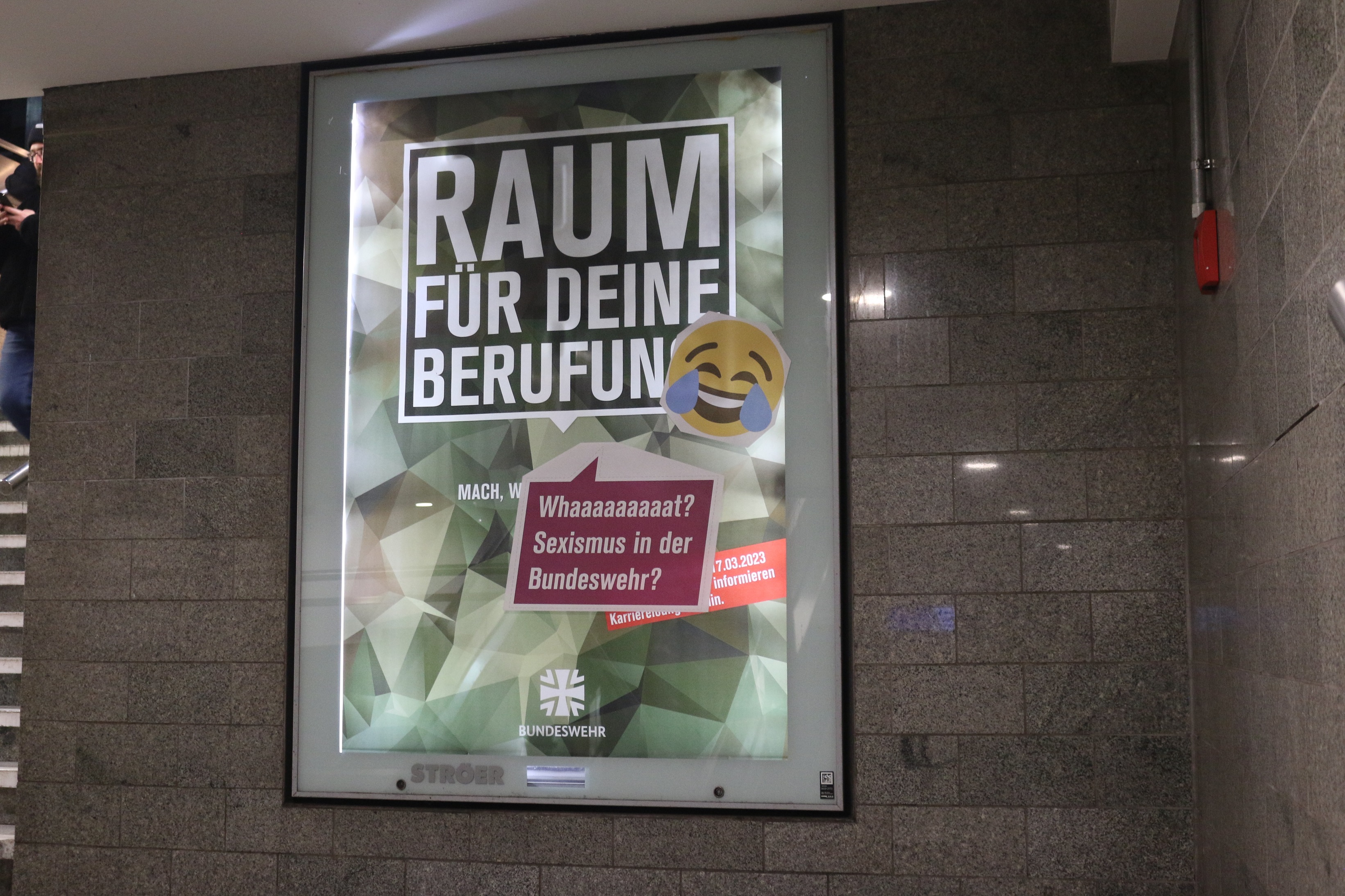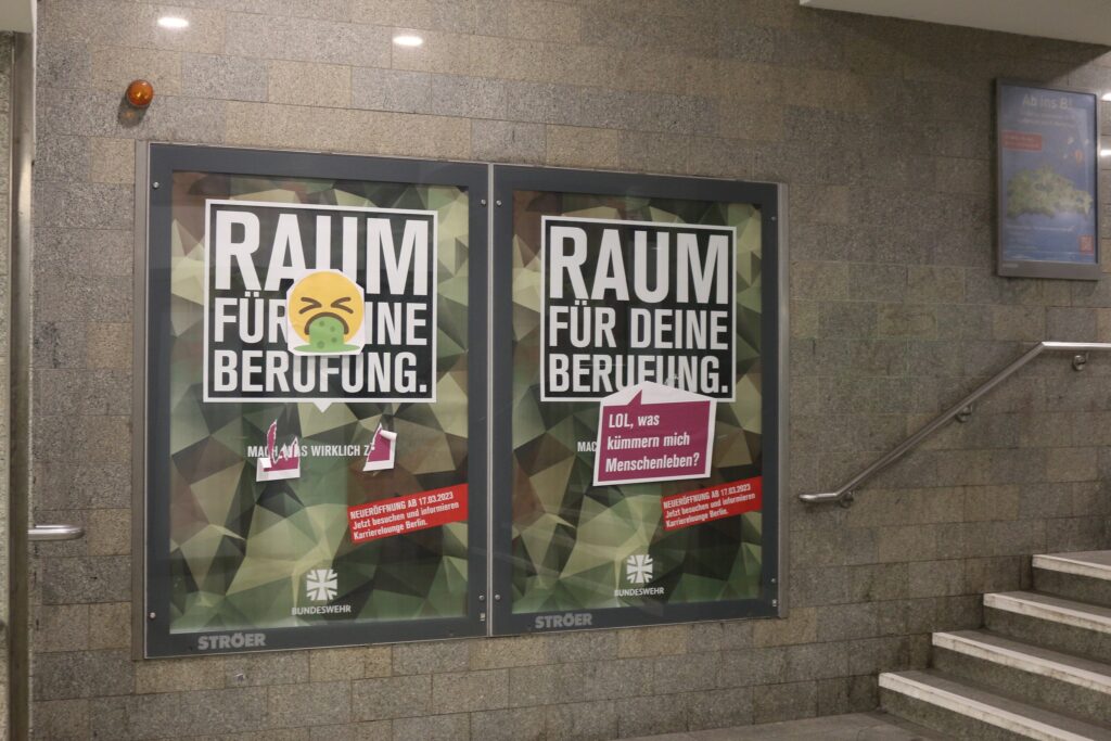 Die Aufkleber erhielten die Aktivist*innen von der Kampagne „Werbung abrüsten“. Die Kampagne „Werbung abrüsten!“ versendet noch immer Sticker-Sets zum Nachmachen in der eigenen Stadt. „Wir freuen uns sehr, dass Aktivist*innen coole Aktionen mit unseren Materialien organisieren!“ sagt Yver Cleber, Sprecher*in der Kampagne „Werbung abrüsten“. Mit lustigen Smileys und Sprechblasen ergänzte Bundeswerbung, wie es sie jetzt am Bahnhof Friedrichstraße gibt, dürfte in den kommenden Wochen also auch anderorts das Stadtbild prägen.