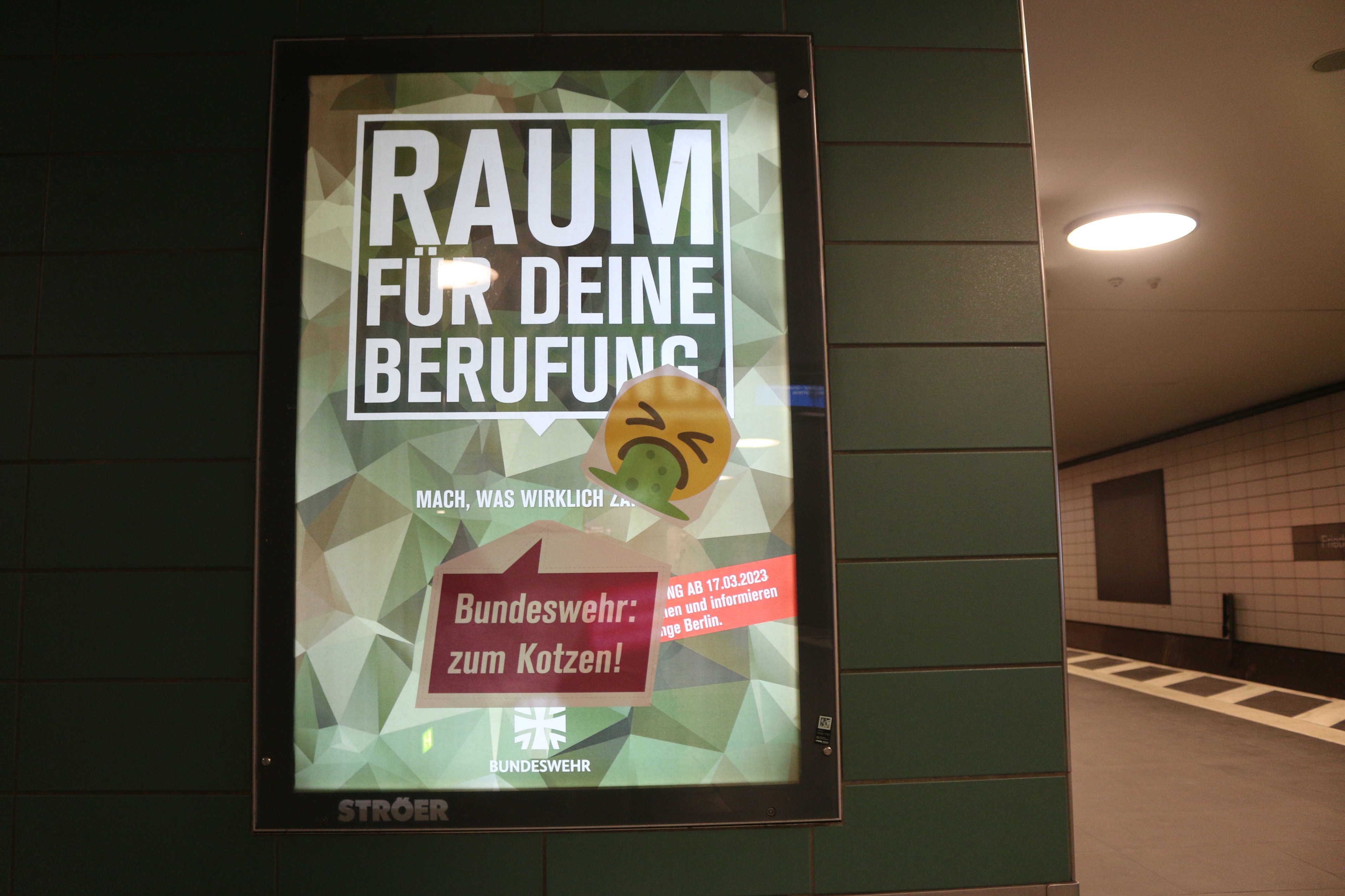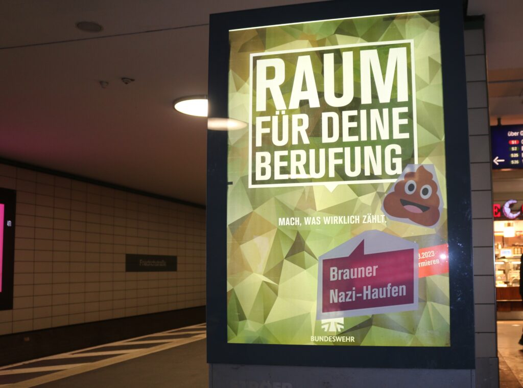 Für die Neueröffnung des „Bundeswehr-Ladens“ am Berliner Bahnhof Friedrichstraße am Freitag hatte die Bundeswehr tief in die Tasche gegriffen und fast alle Werbeflächen im Bahnhog gemietet. Vergebens. Denn nach der Veränderung sind auf den Plakaten Kackhaufen-Smileys zu sehen und „Brauner Nazihaufen“ zu lesen. Kotz-Smileys kleben neben dem Spruch „Bundeswehr: zum Kotzen!“