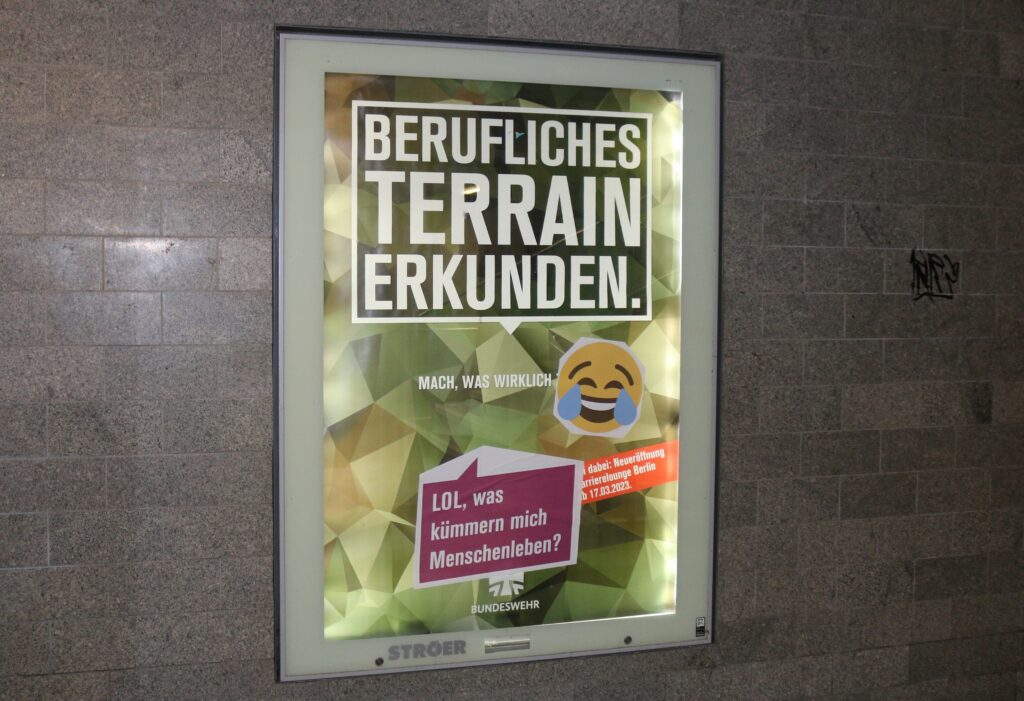 Da staunte die Bundeswehr dieses Wochenende nicht schlecht: Der ganze Bahnhof Friedrichstraße hing voll mit Bundeswehr-Adbustings! Antimilitarist*innen kaperten fast dreißig Werbevitrinen, in denen Werbeposter der Bundeswehr hingen. Die Aktivist*innen ergänzten die Camouflage-Kästen mit Überklebern in Form von Smileys und Sprechblasen, die das Militär kritisieren. Das Militär hatte diese Woche fast alle Werbevitrinen des Bahnhofes gemietet, um auf die Neueröffnung der „Bundeswehr-Karriere-Lounge“ aufmerksam zu machen. „Das Militär versucht, sich als gute Arbeitsgeber*in zu inszenieren“ schrieben uns die Aktivist*innen per Mail. „Mit unseren Stickern durchkreuzen wir diese Propaganda!“
