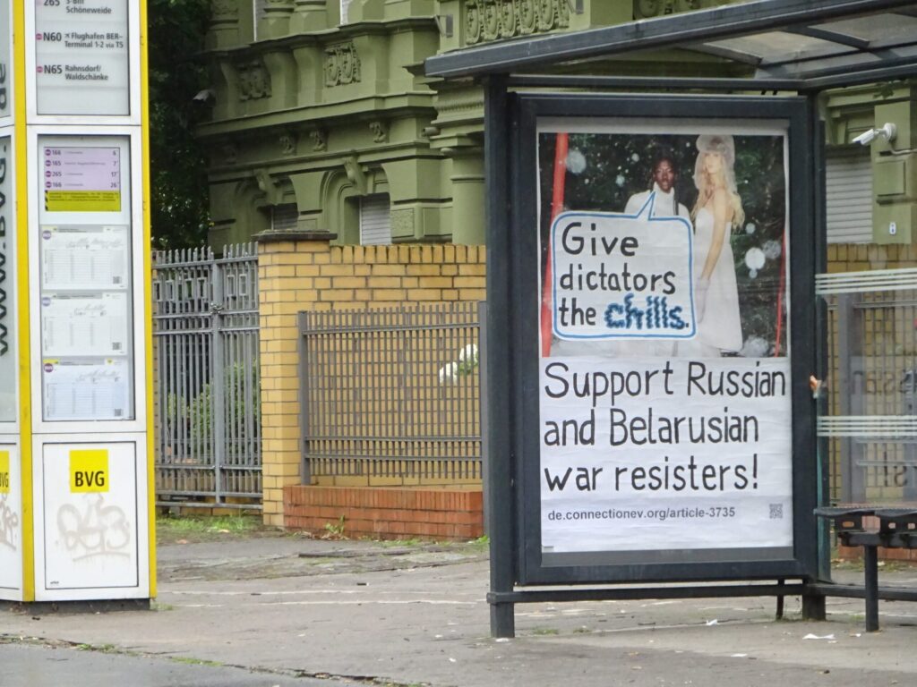 On Indymedia, we saw that there are busted advertisements displayed in Berlin this weekend, demanding asylum for conscientious objectors from Russia, Belarus and Ukraine. Because Indymedia tends to be down very often and we think the action is very nice, we’re mirroring it here. What follows is the text of the group „Asylum for conscientious objectors now!“ (AfCOn!)
